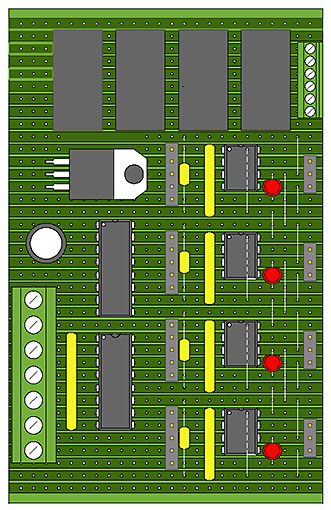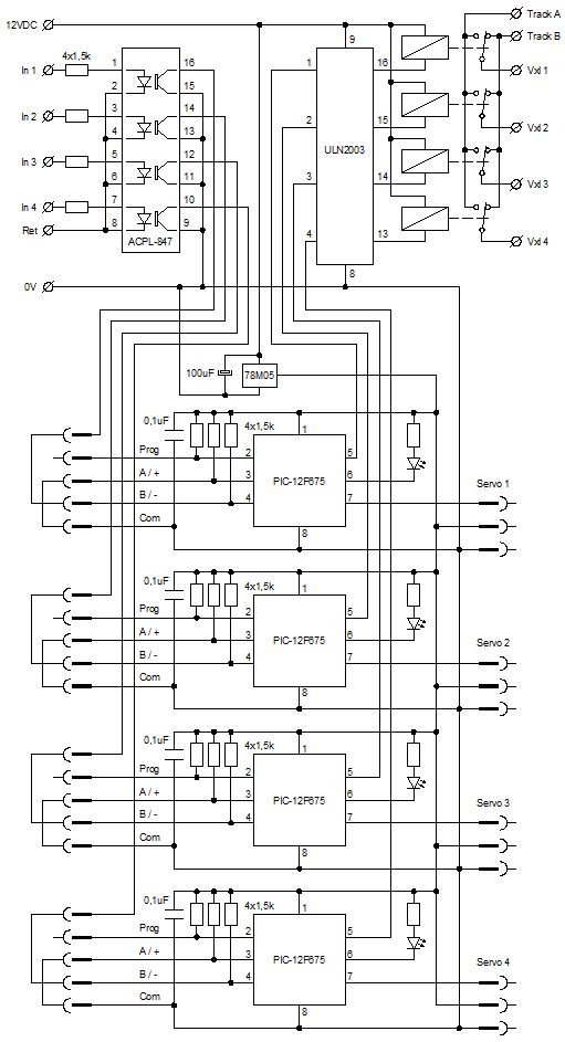 Jag bygger egna kretskort med fyra servostyrkanaler per kort. Dessa placeras i närheten av växlarna och dolda på banans ovansida. Varje kanal har också ett relä för att polarisera växelkorset. Styrsignalerna från ESU's Signal Pilot kopplas via optokopplare för konvertering från 18 volt till 5 volt och ger samtidigt galvanisk isolation. Korten matas med ett eget 12 volts aggregat och blir helt elektriskt frikopplat från banan och funktionsdekodrar. Varje kanal har en 5-polig stiftlist där jag ansluter min programmeringsbox som bara innehåller 3 tryckknappar, P/+/-. Efter programmering pluggar jag i stället in en hylskontakt med två trådbyglar som väljer typ av styrning och koppling av signal från optokopplare.