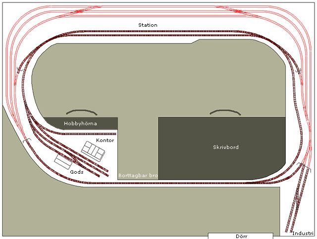 Har funderat i många år. Men detta kan nog bli verklighet. Banan ska byggas i mitt kontor/hobbyrum och vila på ett antal bokhyllor, IKEA Billy, som jag sedan länge placerat just med tanke på banbygget. De röda spåren är det dolda tågmagasinet som kan husera 6 tåg med längder på 1,5 till 1,9 meter. Magasinet ser ut att rymma upp till 9 tåg men 3 av spåren är genompassage. Kan dock användas till att parkera diverse fordon när man inte kör trafik. Banan tar upp ca 3,8 x 2,2 meter plus den lilla industrin nere till höger.