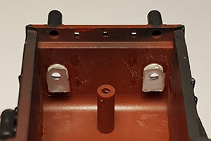 Jag har även bytt strömavtagare till den typen som Jeco har på D-loken och som jag köpte som reservdel. Den är betydligt snyggare och med rätt utseende. Den blev "stelopererad" till höjden 64 mm över RÖK och med bortopererad ful fjäder. Hålet i loktaket för fästskruven till den gamla strömavtagaren sattes igen och två bulor togs bort varefter taket bättringsmålades.