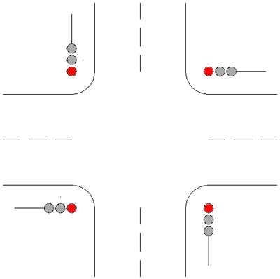 Jag har försökt att filma min testuppkoppling som demonstration men det gick inte så bra. Jag har ingen riktig videokamera tyvärr. Jag gjorde en animering i stället. Tiderna för gult ljus är 1,3 och 3,9 sekunder som jag uppmätt här i Gävle. Borde vara standard. Grön tid är här 10 sekunder. Alla tider kan dock enkelt ändras.