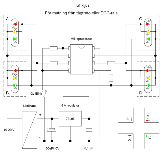 Studera kretsschemat här nedan så ser du att det räcker med en liten mikroprocessor och fyra motstånd för att styra trafikljusen i en vägkorsning. Det räcker dessutom med tre trådar till varje stolpe. Mikroprocessorns program är skrivet och allt fungerar perfekt. Det finns också en liten switch med vilken man kan slå om till gult blinkande sken åt alla håll indikerande trafikljus ur funktion. Nu återstår att fixa själva trafikljusen. Och bygga en bana att ha dem på förstås.