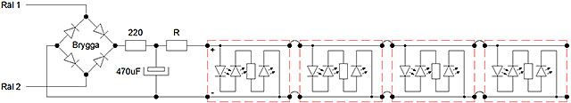 Likriktare, strömbegränsningsmotstånd och backup-kondensator blir lika i alla vagnar. Efterföljande motståndet R bestämmer ljusstyrkan och varierar från 8,2k till 15k. Ledlisten jag klistrar i vagnstaken köper jag på Kjell & Company. Den är klippbar i segment om tre LED. I 80-talsvagnar har jag 5 ledlist-segment. I de övriga har jag 4 segment.
