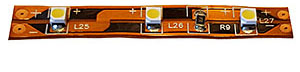 Sätter en avklippt bit remsa med en lysdiod längst till höger med ett 56 kohms motstånd i serie för att få lite ljus även i den vestibulen. 10 kohms motståndet syns uppe längst till vänster.