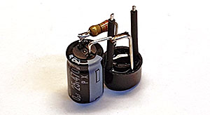 Jag löder ihop likriktare, kondensator och 220 ohms motståndet "i luften" utan kretskort. Ingångsbenen på likriktaren isolerar jag med krympslang. Fäster sedan det hela i det större toalettutrymmet med dubbelhäftande tejp i golvet. |