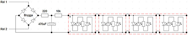 Det blir en mycket enkel lösning med en likriktarbrygga, en kondensator och två motstånd. Motståndet på 220 ohm förhindrar hög belastning vid start när kondensatorn ska laddas upp. Motståndet på 10 kohm ger lagom ljus i vagnen. Det ska ju inte se ut som ett solarium. Strömförbrukning blir endast 0,5 mA vid 15 volts DCC-spänning och lyser i flera sekunder om matningen upphör. Kretsschemat nedan visar det hela.