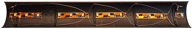 Till belysningen använder jag självhäftande lysdiod-remsa på rulle. Jag klipper 4 bitar som jag fäster under taket. |
