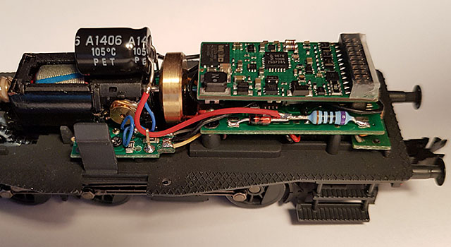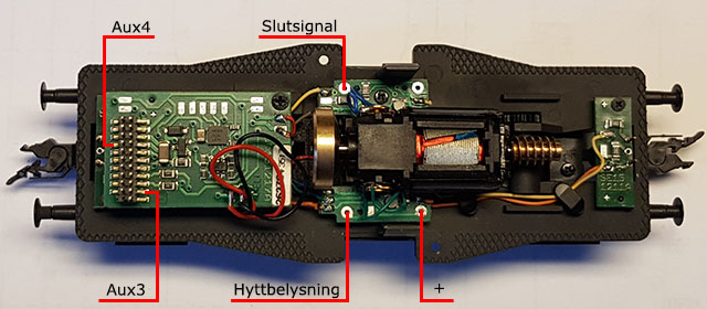 Lite är förberett för slutsignal redan. Ett 20 kohms motstånd sitter på mittkortet och en löd-pad för en tråd som jag drar till Aux4. Anslutningen jag använder för hyttbelysning har inget motstånd men det monterar jag på kortet i direkt anslutning till dekoderkontakten Aux3. Men även här finns på mittkortet en löd-pad som jag ansluter till motståndet vid Aux3. Att löda in trådar direkt på dekoderkontakten kräver en riktigt smal lödspets och god lödvana.