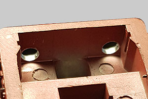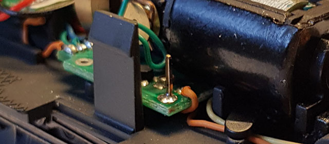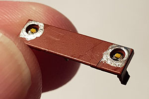 De 4 hålen/lödöarna är ju avsedda för anslutningspinnar till hytten. De var monterade på Trix förra utgåva, lok 717. Jag monterar i stället 0,5 mm guldpläterade kontaktstift i tre av hålen. Tre kontakthylsor med pålödda trådar ansluter sen upp till hyttaket. Man vill ju ha möjlighet att koppla loss hytten.