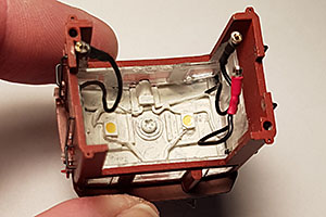 Här syns de tre anslutningstrådarna med hylskontakter överdragna med krympslang. Målade också insidan av hytten i ljusgrått. |