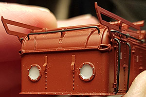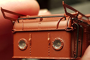 När silvertuschet torkat ordentligt, gör jag nya "glas" i kåpans öppningar med Micro Kristal Klear. Ljusöppningarna har ju lite fel form på Trix-loket men den upplevda helheten blir så mycket bättre. Det är lite trixigt att använda Micro Kristal Klear då man måste passa torkningen och fylla på flera gånger eftersom det lätt blir svackor i mitten. Jag ställer kåpan på högkant under torkningen och fyller på på baksidan för att inte sabotera "glasets" utsida.