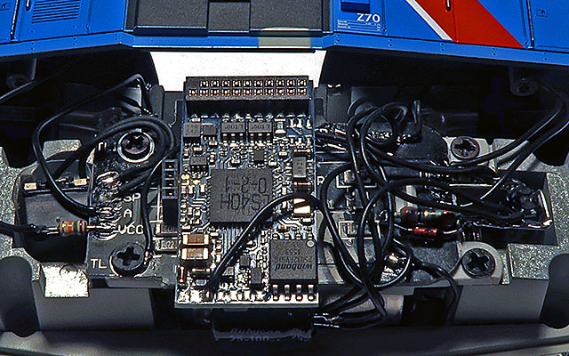 I mitten ser man den enda tråden inlödd på dekodern. Man bör vara van att löda små saker på kretskort för att inte riskera att fördärva dekodern. Under dekodern syns en av kondensatorerna. Jag har cyanolimmat en på varje sida om motorn.