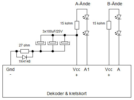Backup-kretsen här med tre kondensatorer och uppladdningsbegränsaren kopplas ju normalt till två lödöar på dekodern. Eftersom plus-matning till lampor/leds (märkt Vcc) är detsamma som plusanslutningen för backup så har jag kopplat kondesatorerna till Vcc. Blev lite enklare så och bara en tråd som kopplas direkt på dekoderkortets (-). Med bara 300 uF så valde jag motståndsvärde 27 ohm i stället för 100 ohm som ESU anger. Motståndet gör ju att uppladdningsströmmen begränsas lite. Dioden gör att urladdningen inte begränsas.